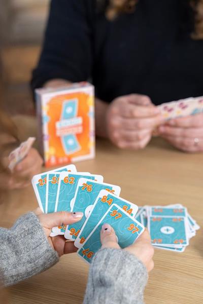 EKKO is a real party game. During the game, all players must pay attention to what is going on around the table. Indeed, a player can, at any time, play a Mirror card and thus steal his opponents' turn. The Mirror card of a card is the one whose numbers are reversed compared to this card. For example, 73 is the Mirror card of the card 37. Playing a Mirror card allows you either to make all players draw or to get rid of a card! There is also a strategic aspect to the game, because when it is your turn to play, you play a card according to what was played by the previous player. For example, if I place my 02 (on which is indicated the sign -), the next player will have to play less than 02, which is very unlikely since the cards go from 01 to 98, forcing him again to draw a card.