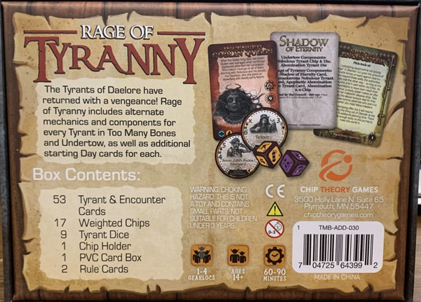 Rage of Tyranny includes alternate mechanics and components for every Tyrant in Too Many Bones and Undertow, as well as additional starting Day cards for each.