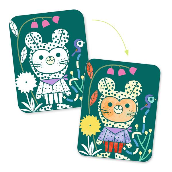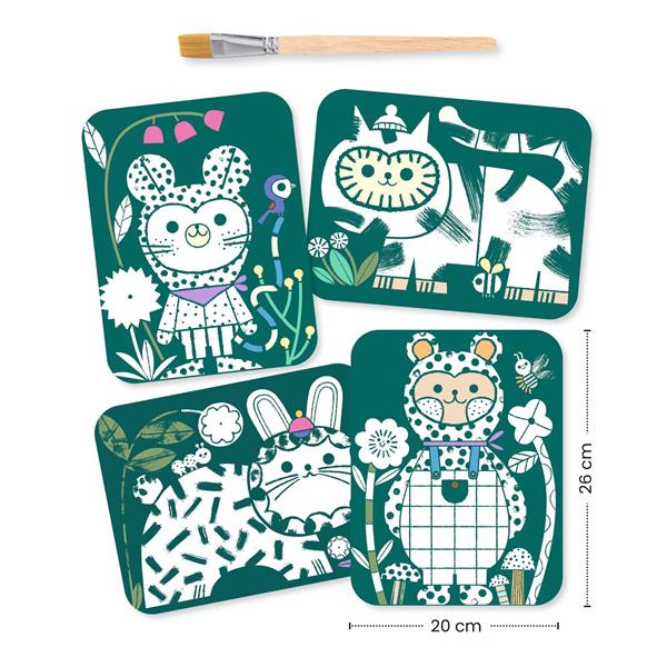 With just a few drops of paint on the wooden paintbrush, children can colour in the illustrations as if by magic! The black areas, covered with a special paint, instantly change colour when they come into contact with water: an original, mess-free, and fascinating process for children. Easy to set up: painting is guided by a varnish which helps to limit spillover. This activity includes everything needed to create beautiful pictures, is mess-free and doesn’t require cumbersome equipment. Surprise guaranteed: which colour will appear under the brush? Content : 4 boards to paint, a little wooden paintbrush and 1 booklet.