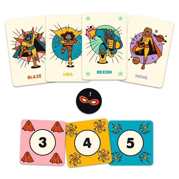 6 superhero cards, 30 superpower cards and 1 first player token. Rules of the game in 10 languages.