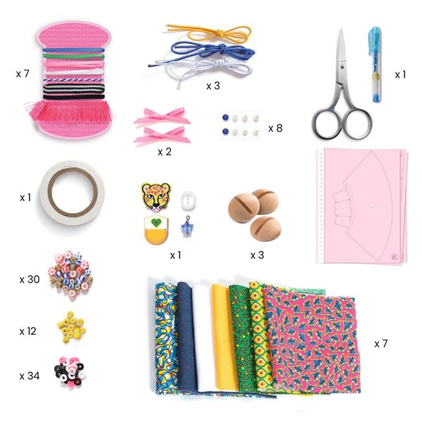3 dolls, 3 wooden bases, 4 printed fabrics, 3 fabrics made of various materials, 7 braids or ribbons, 3 elastic threads, 2 embroidered patch stickers, a bag of beads and little accessories, 1 sheet of rhinestone stickers, 1 pair of scissors, 1 roll of double-sided tape, 1 pen and 3 pattern boards.