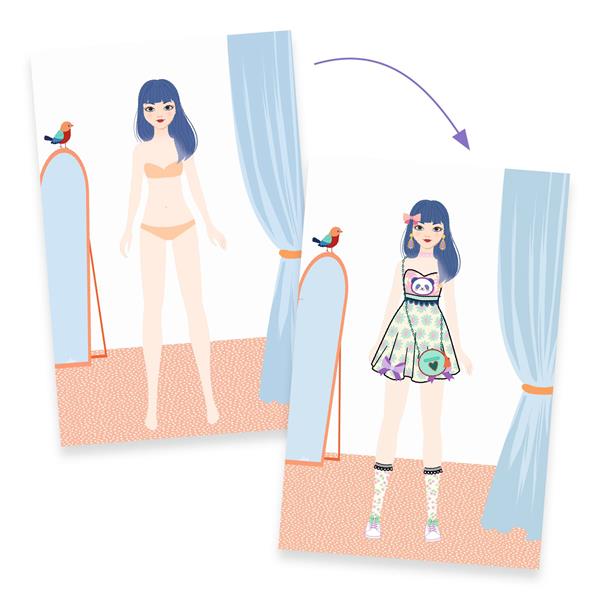 An arts and crafts kit for aspiring designers! The child chooses a silhouette card and uses the pre-cut clothes as stencils to easily copy them onto their drawing. Next, they pick a pattern from the sheets provided and complete their creation with the golden stickers. Each design becomes a truly original and custom stylist’s creation.