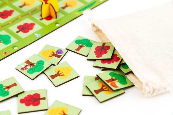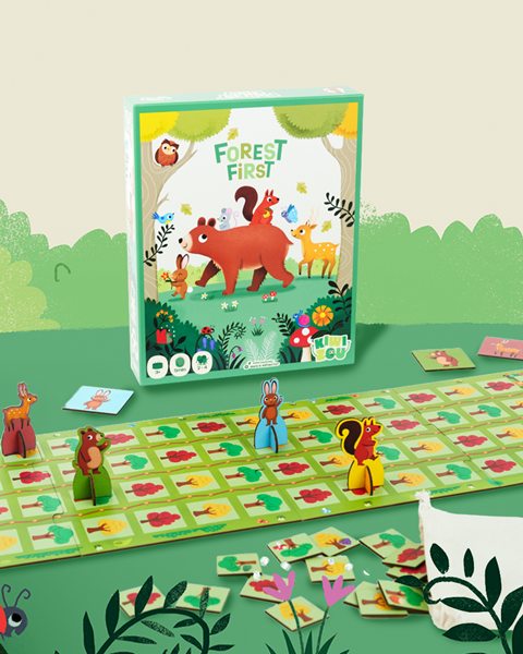 In Forest First, players take on the role of forest animals in a race: the first to reach the end of their line wins the game. To move, there's no need to manipulate a die or count squares, as moves are made using a color-coded system: the tile drawn indicates which tree to advance on.