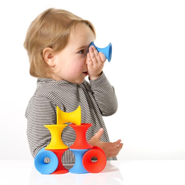 Tulu reinvents the building block. Instead of square cubes, you can now stack and balance balls and other round objects – Tulu provides the missing link. In classic MOLUK fashion, the elastic spool shapes become versatile play objects that grow with your child. Tulu shines as an elegant grasping and teething toy for babies. Toddlers will stack, roll, or nest the pieces. You can thread a string or cloth through them or sort them by color. Combine Tulu with Bilibo Mini and other MOLUK toys to create even more adventurous constructions, or use them as open-ended accessories in pretend play! Tulu playfully trains fine motor skills, coordination, and concentration while engaging the child's imagination and curiosity. You will be astonished at how many possibilities your child will discover with these deceptively simple shapes!