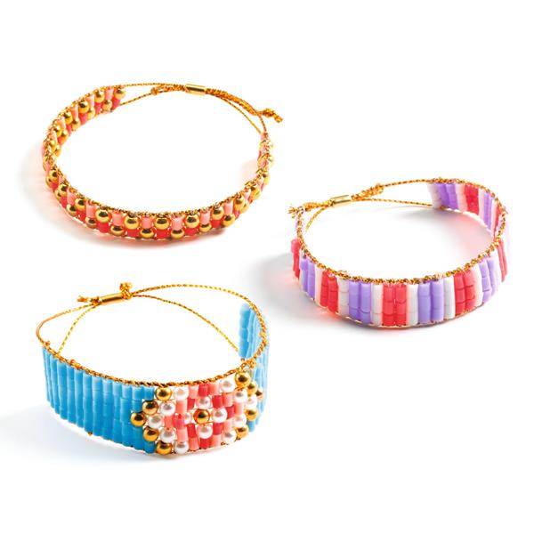 10 sortes de perles, 1 métier à tisser en bois, 2 bobines de fil doré et 1 livret explicatif pas à pas.