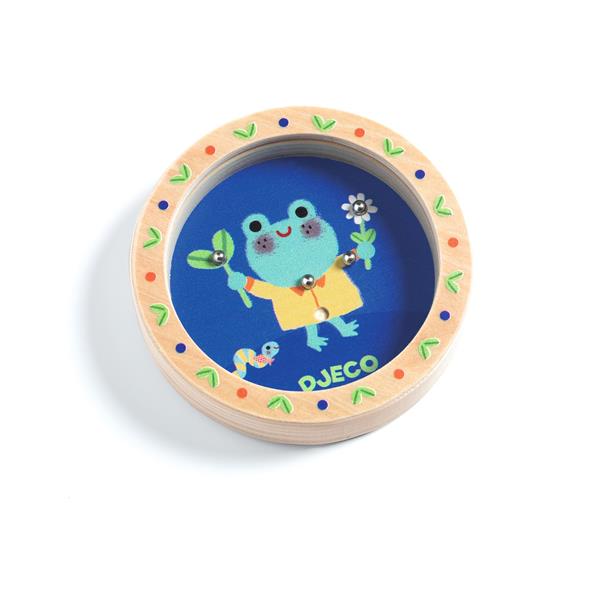 Petit jeu de patience circulaire en bois : l'enfant doit faire preuve d'adresse pour placer les billes dans les trous cachés dans le décor. Facile à transporter, il occupera les petits et stimulera leur dextérité. Existe en différentes illustrations : grenouille, coccinelle, papillon.