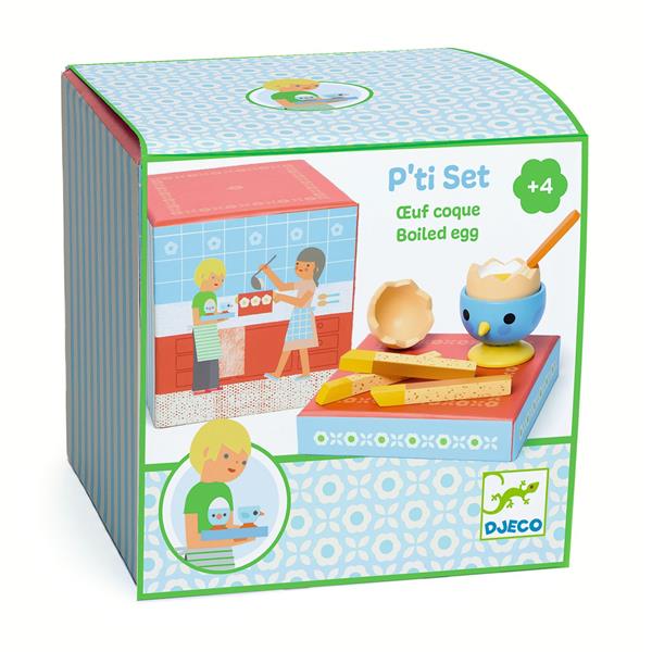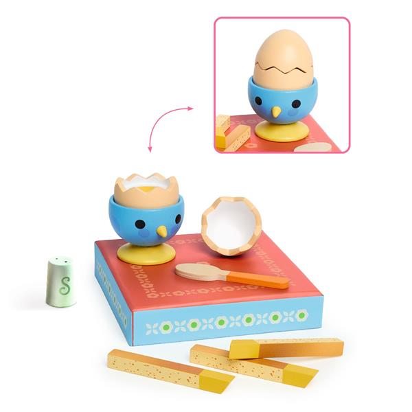 8 pièces : 1 cuillère, 1 coquetier, 1 œuf en 2 parties, 3 mouillettes de pain, 1 salière en bois.