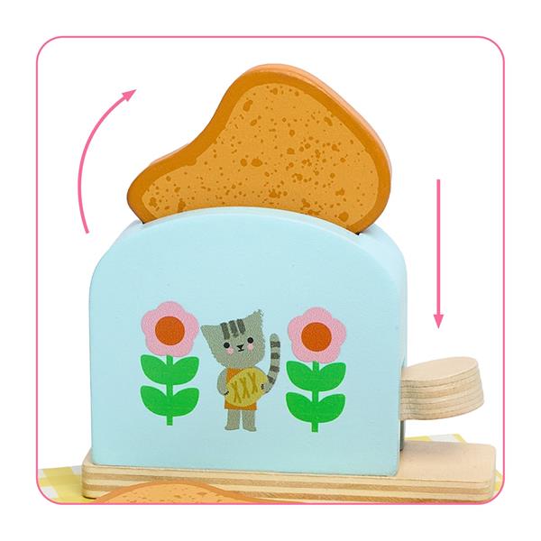 C’est l’heure du petit déjeuner ! Ce joli coffret d'accessoires en bois et feutrine contient tout le nécessaire pour bien commencer la journée. L’enfant pourra préparer de délicieuses tartines grillées, les napper de confiture et servir un bol de céréales rempli de lait. La boîte illustrée d’une scène d’enfants cuisinant joyeusement crée une atmosphère douce et familiale.
