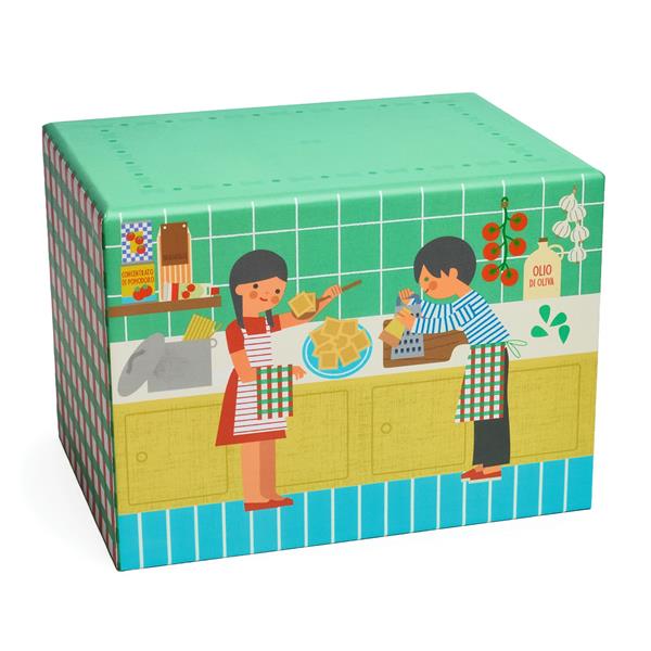 Bienvenue en Italie, pays de la pasta et de la bonne humeur ! Ce coffret permet de préparer un délicieux plat de pâtes : raviolis, sauce tomate, parmesan et ustensiles de cuisine sont au rendez-vous. L’enfant s’amuse à mélanger, servir et inventer ses propres recettes, comme un vrai chef italien. Chaque boîte s’ouvre sur une jolie scène illustrée d’enfants cuisinant dans une cuisine aux couleurs de leur pays, plongeant ainsi l’enfant dans l’ambiance gourmande et culturelle de chaque destination.