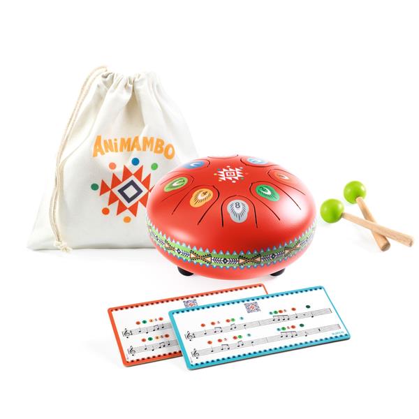 Tambour en acier de 15 cm de diamètre joliment illustré sur le thème amérindien. Cet instrument de musique à percussion comporte 8 languettes correspondant à 8 notes de musique. Très intuitif et facile à jouer, l’enfant tape sur les languettes avec les baguettes : par ses vibrations, l’instrument émet un son doux et relaxant. Parfait pour créer ou reproduire des mélodies apaisantes ! Le cadeau idéal pour les petits musiciens à partir de 5 ans.