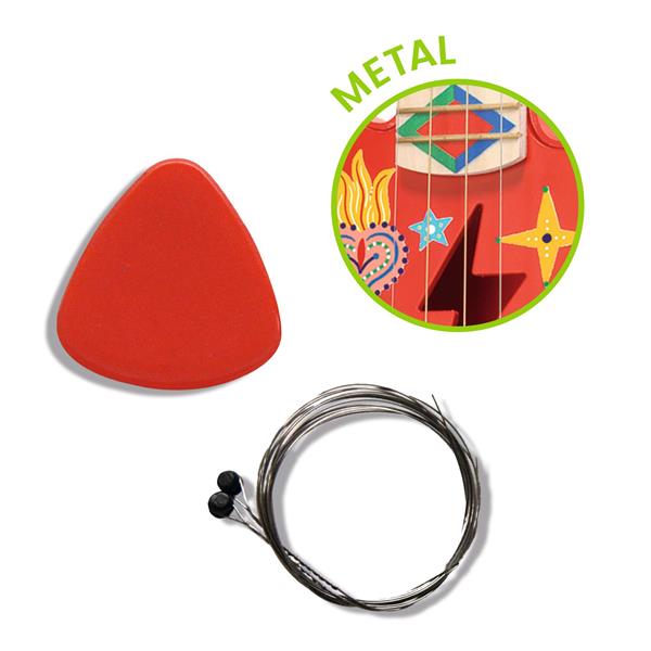 1 guitare (bois, métal et plastique), 1 médiator, 2 cordes de rechange.