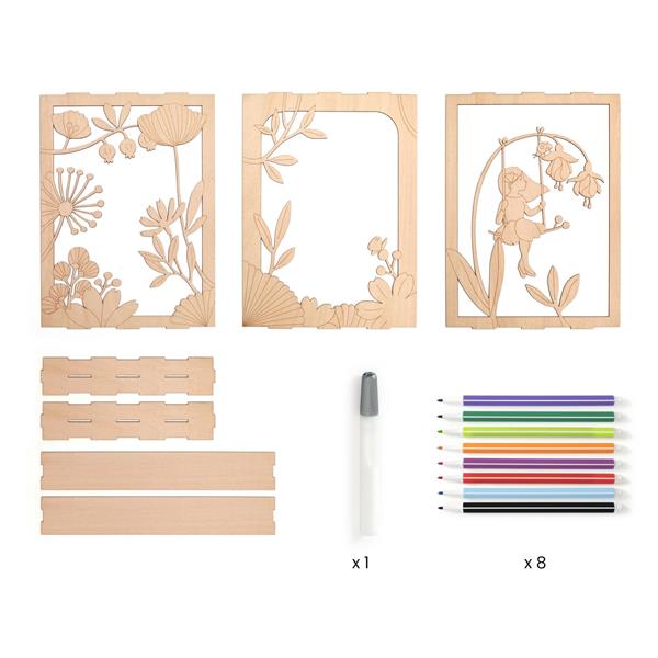 3 panneaux de bois (14 cm x 19 cm), 4 planches de fixation, 1 sachet d'éléments de bois en relief à coller, 1 tube de colle à bois (10,5 ml), 8 feutres.