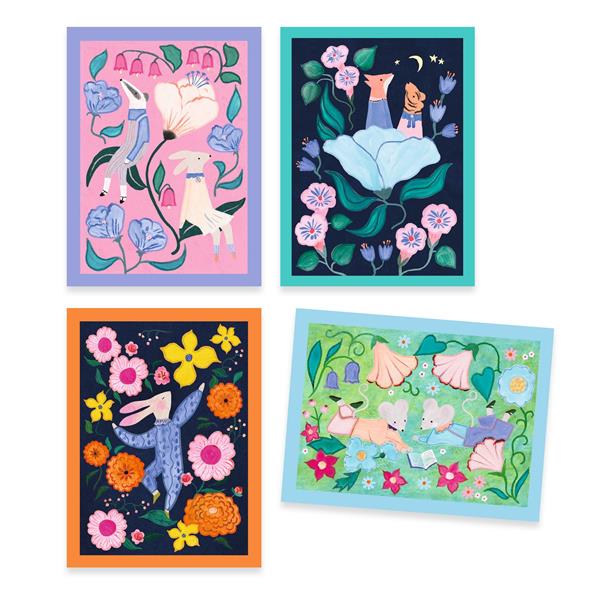 4 tableaux à peindre (21 cm x 28 cm), 4 cadres colorés, 1 véritable palette en plastique avec 10 godets de peinture, 1 pinceau.