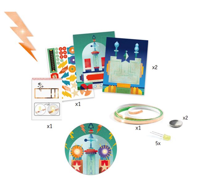 L'enfant applique un adhésif conducteur sur les bases illustrées pour dessiner des circuits électriques. Les tableaux deviennent interactifs grâce à d'ingénieux systèmes d'interrupteurs.