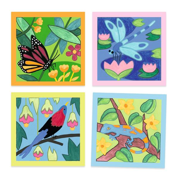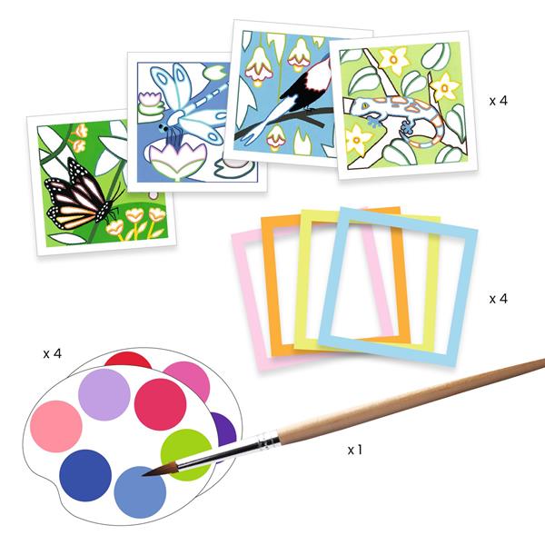 4 cartes à peindre (20 cm x 20 cm), 4 cadres colorés, 4 palettes en papier avec 6 ronds de peinture, 1 pinceau.
