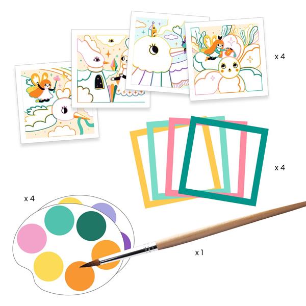 Une pochette idéale pour s’initier à la peinture : 4 cartes aux zones clairement délimitées, chacune accompagnée de sa palette de couleurs correspondante. Avec très peu d’eau, l’enfant peint facilement de larges surfaces comme de petits détails, puis associe sa réalisation à l’un des 4 cadres fournis pour la finaliser et l’exposer. Une activité simple à mettre en place pour commencer à peindre en toute autonomie. Contenu : 4 cartes à peindre (20 cm x 20 cm), 4 cadres colorés, 4 palettes en papier avec 6 ronds de peinture, 1 pinceau.